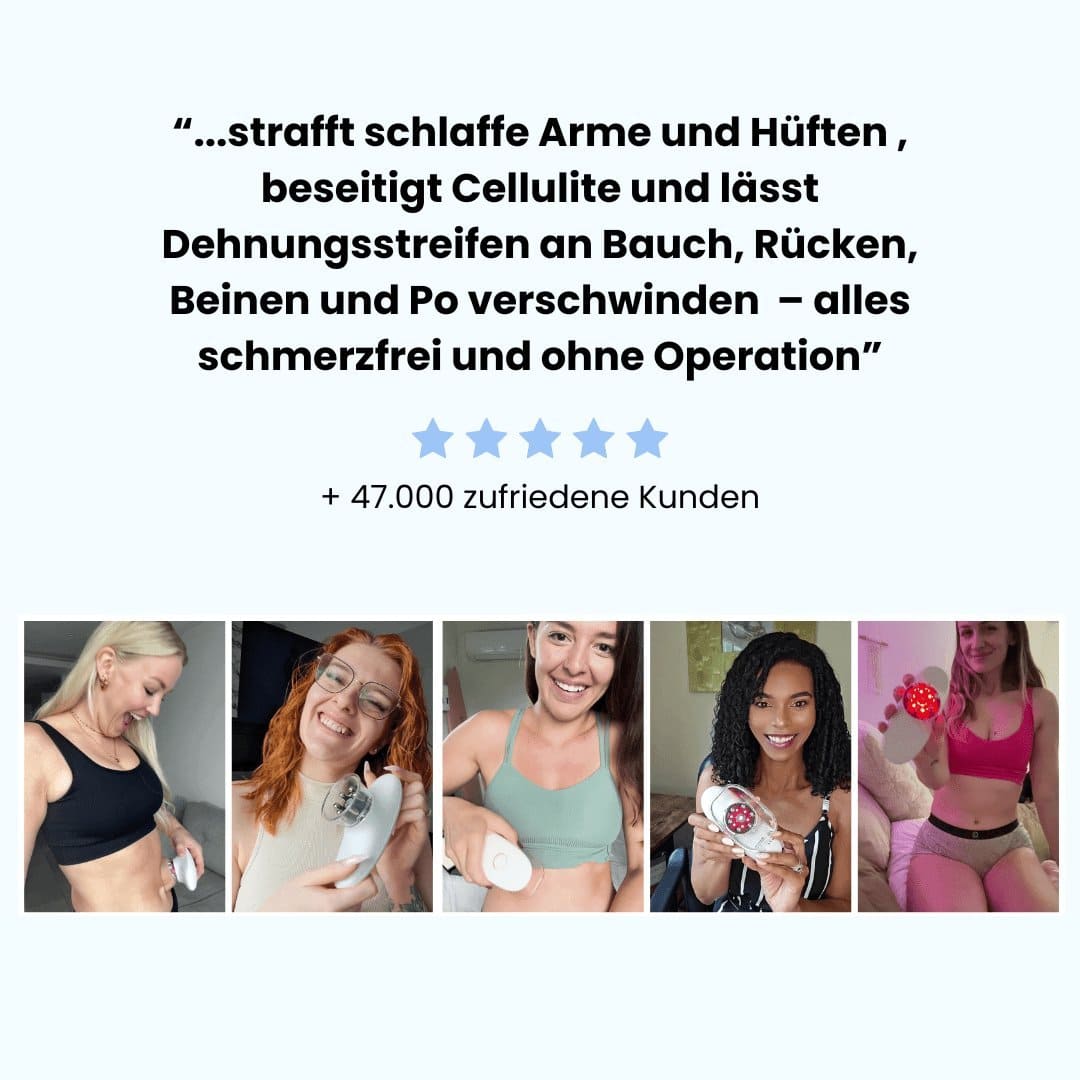 Dein Nr. 1 Gerät zur Hautstraffung und Fettreduzierung für zu Hause. Sichtbare Ergebnisse nach 3-4 Wochen, vollständige Resultate in sechs bis zwölf Wochen.